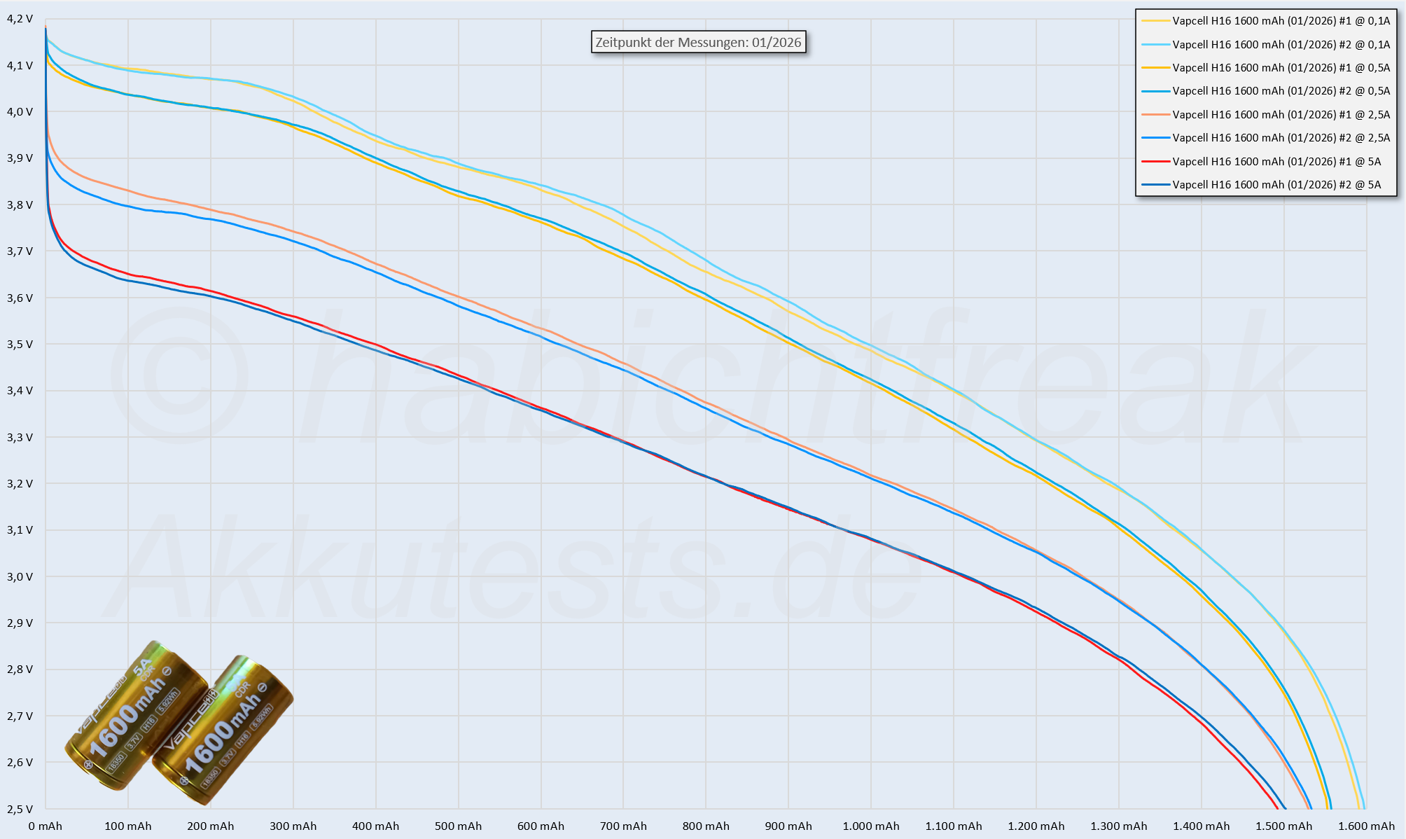 Note: I test batteries in my free time. I analyze discharge curves under different loads, internal resistance, etc. However, I don't conduct long-term tests in the form of cycle tests. The conclusion of the battery test: It says 1600 mAh on the label, and that's exactly what the H16 delivers. 5A CDR is a plausible value, and the temperatures reach a non-critical 58°C. It's an 18350 format battery with the currently highest capacity. If you'd like to read the full test: https://akkutests.de/test-vapcell-h16.html