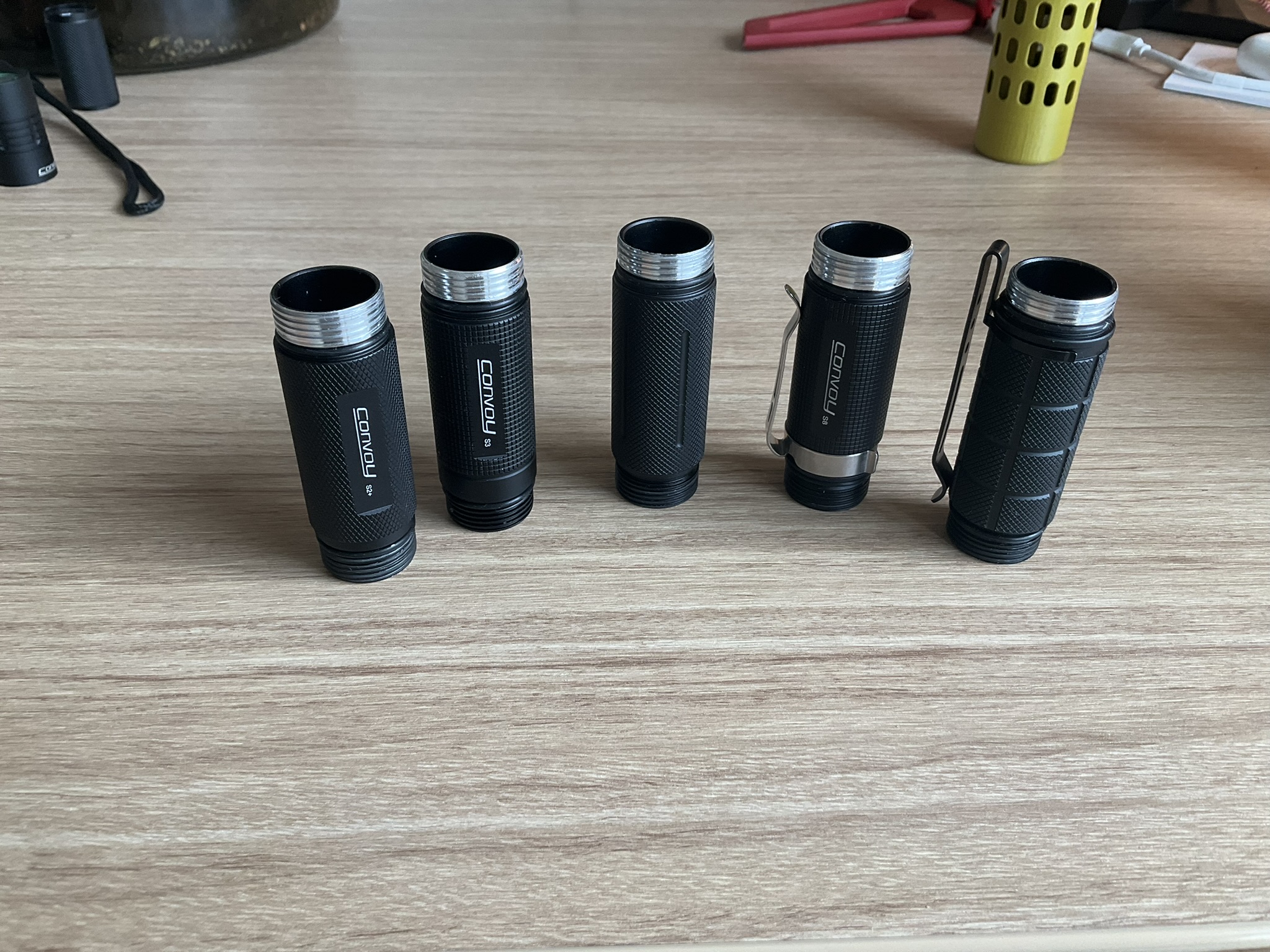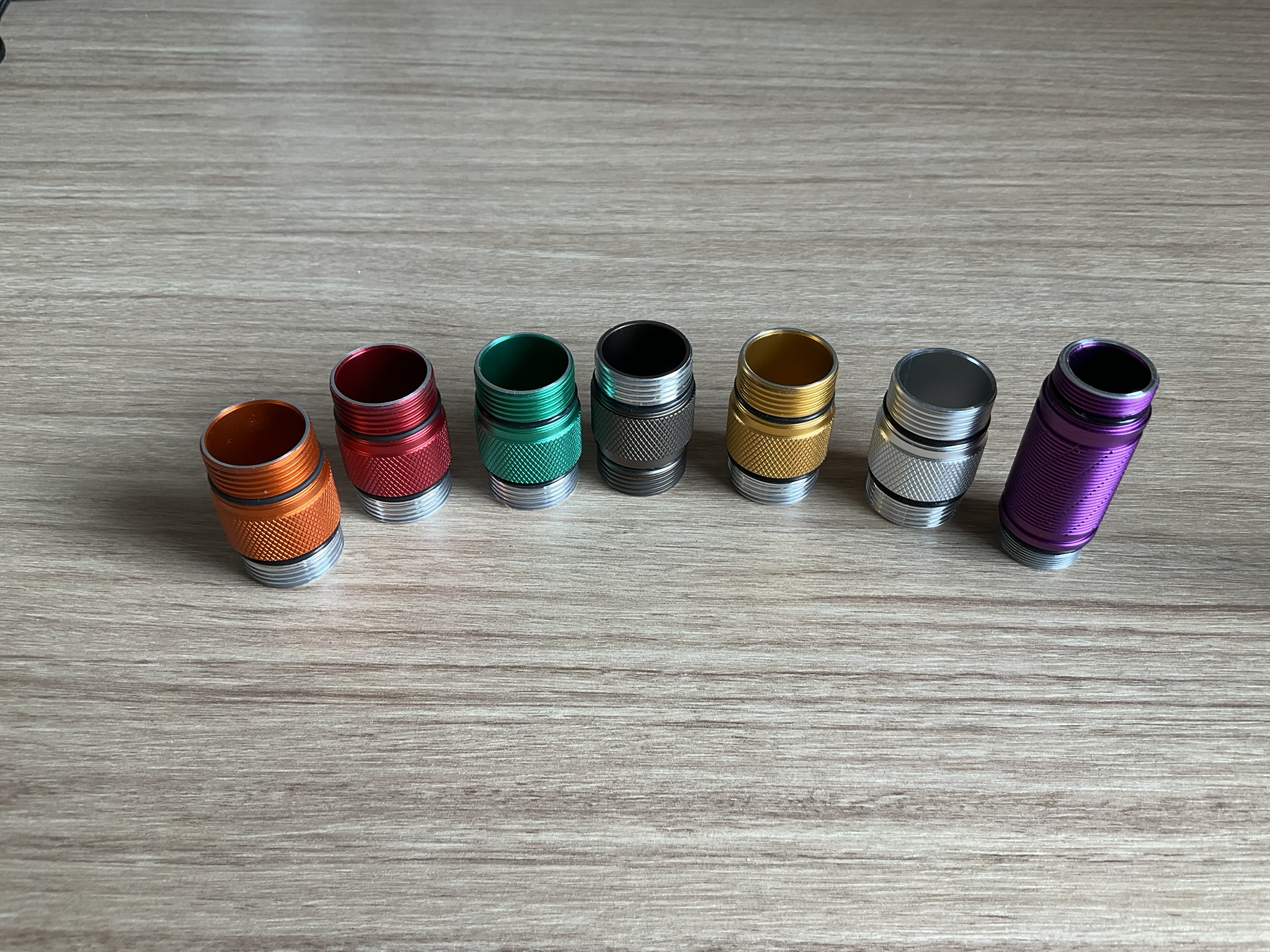 Just posting to show the colors. These have a 1.5mm pitch square thread are compatible with the S2+, S3, S6, S8, and S15. I find them useful to make black flashlights more visible and color code what emitter I have installed.. Left to right are orange, red, green, tan, gold, silver, and purple. - FarBox400