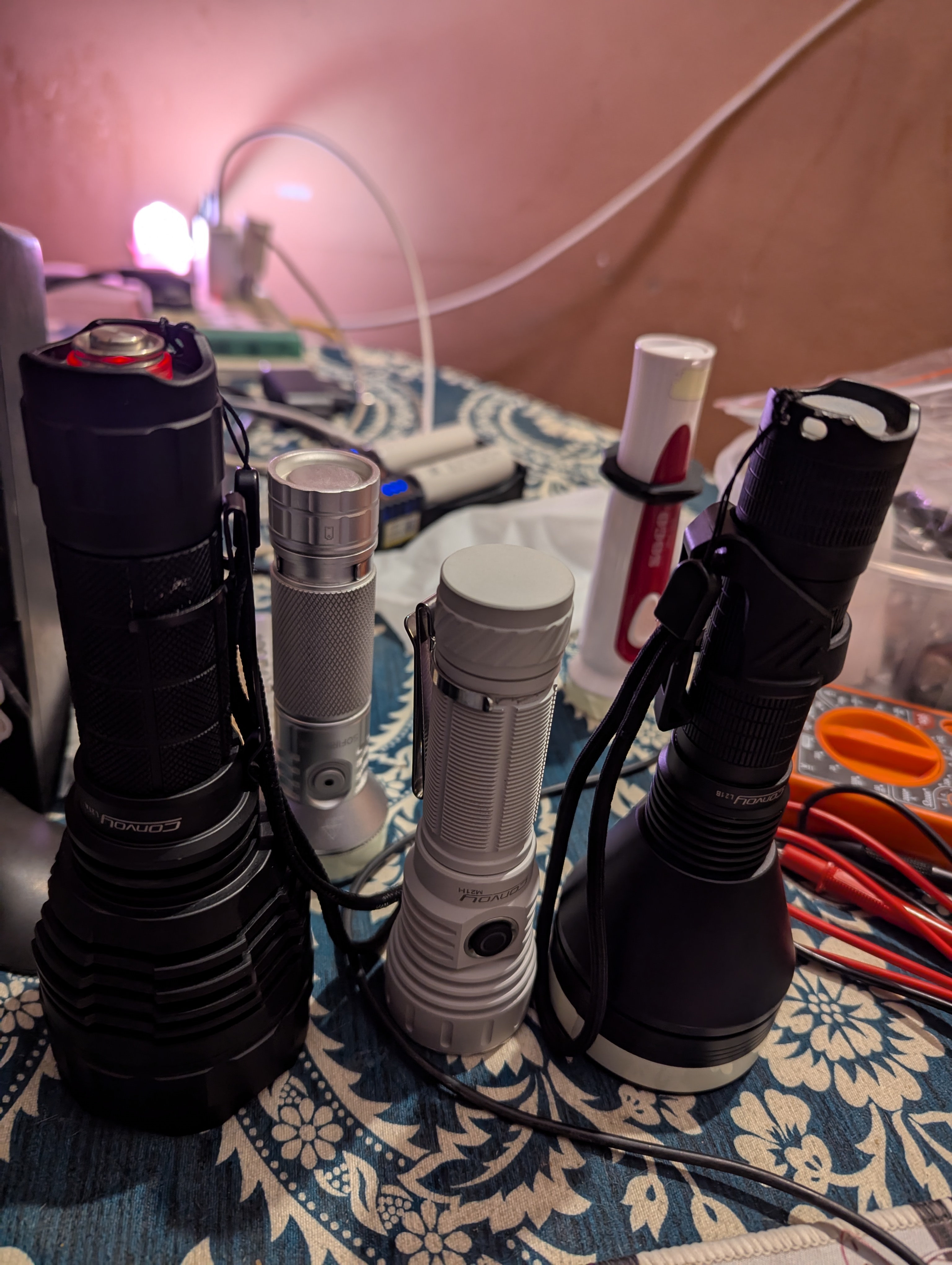 UPDATED REVIEW: Ok so after almost 5 months of use and multiple drop this light is the MOST PERFECT one that i had been searching for, but i had to make it myself, My choice was SFT40 3000K almost 100 CRI, 3 degree tir and butterfly gasket to make the beam profile clean and tighter, this beast throws easily 450m and 650m with SFT25R 5000k, but i prefer SFT40 3000k bigger hotspot and HIGH CRI and gorgeous tint, you can also change TIR lens for more flood etc if needed, but the spill is plenty enough to walk around, heck i hiked 6000 feet up a mountain during night time without pointing it at the ground the spill was enough to walk at 2/4 and the light lasted all the way back down, the only complain i have is no AUX leds or Anduril but those are just dumb complain, because this light is amazing, i wish simon would sell sft40 config. p.s last pic is sft25r in m21h it has a perfect round circle beam like that of if22a. sft40 has two circles not noticeable in real life usage but in pics. i also recommend the aliexpress plastic pocket clip it shreds pockets all convoy pocket clips are unfortunately useless on this bad boy.