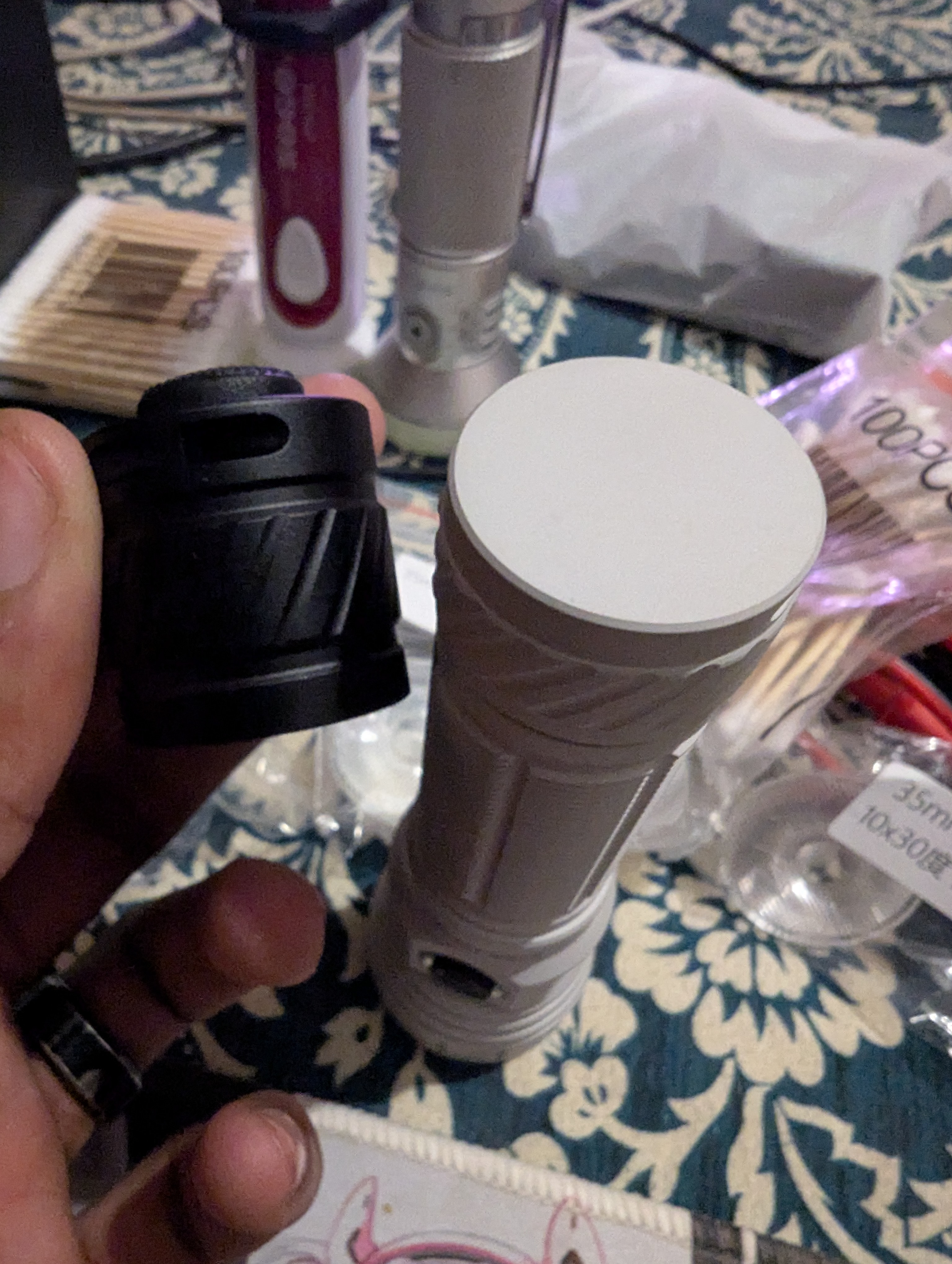 UPDATED REVIEW: Ok so after almost 5 months of use and multiple drop this light is the MOST PERFECT one that i had been searching for, but i had to make it myself, My choice was SFT40 3000K almost 100 CRI, 3 degree tir and butterfly gasket to make the beam profile clean and tighter, this beast throws easily 450m and 650m with SFT25R 5000k, but i prefer SFT40 3000k bigger hotspot and HIGH CRI and gorgeous tint, you can also change TIR lens for more flood etc if needed, but the spill is plenty enough to walk around, heck i hiked 6000 feet up a mountain during night time without pointing it at the ground the spill was enough to walk at 2/4 and the light lasted all the way back down, the only complain i have is no AUX leds or Anduril but those are just dumb complain, because this light is amazing, i wish simon would sell sft40 config. p.s last pic is sft25r in m21h it has a perfect round circle beam like that of if22a. sft40 has two circles not noticeable in real life usage but in pics. i also recommend the aliexpress plastic pocket clip it shreds pockets all convoy pocket clips are unfortunately useless on this bad boy.