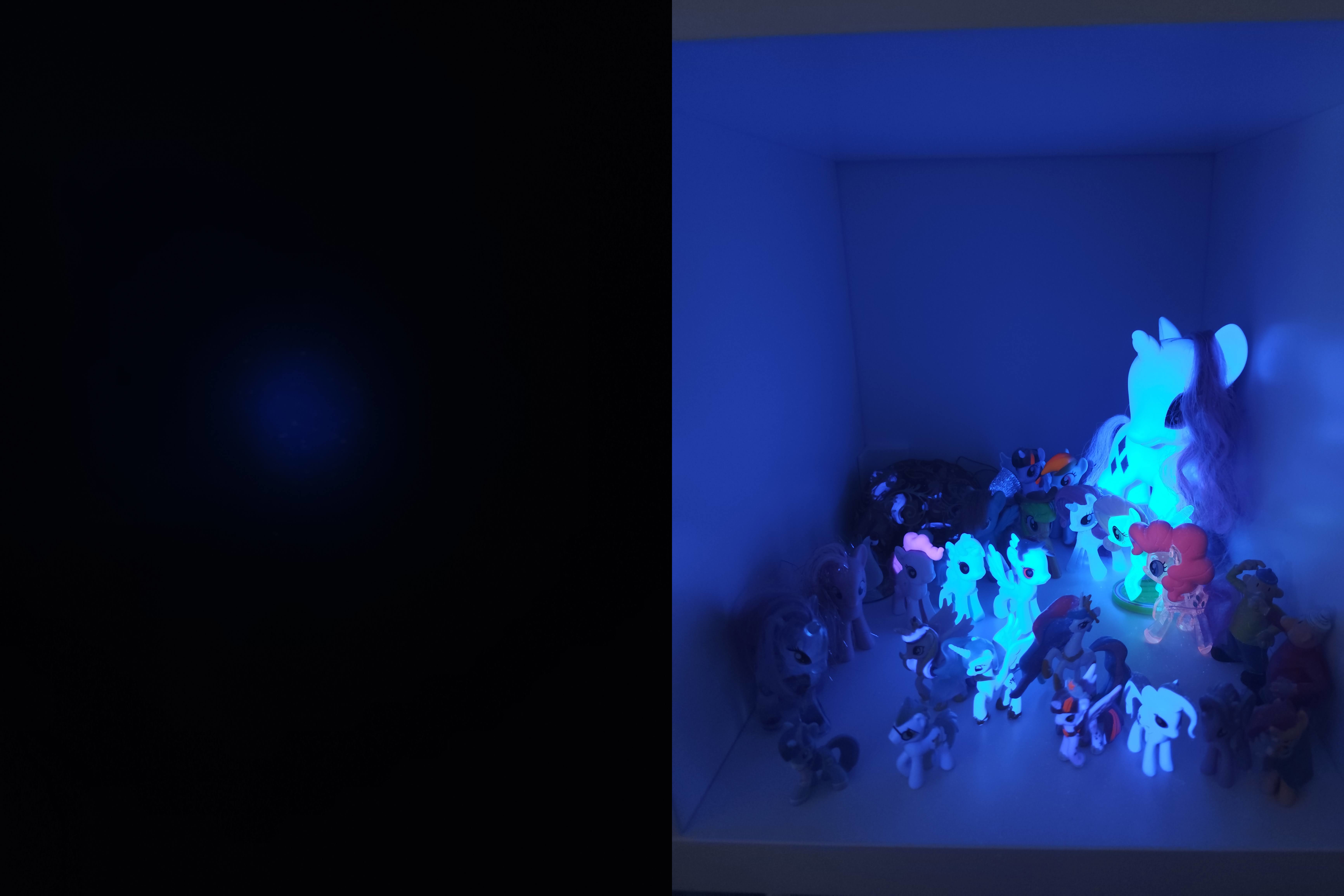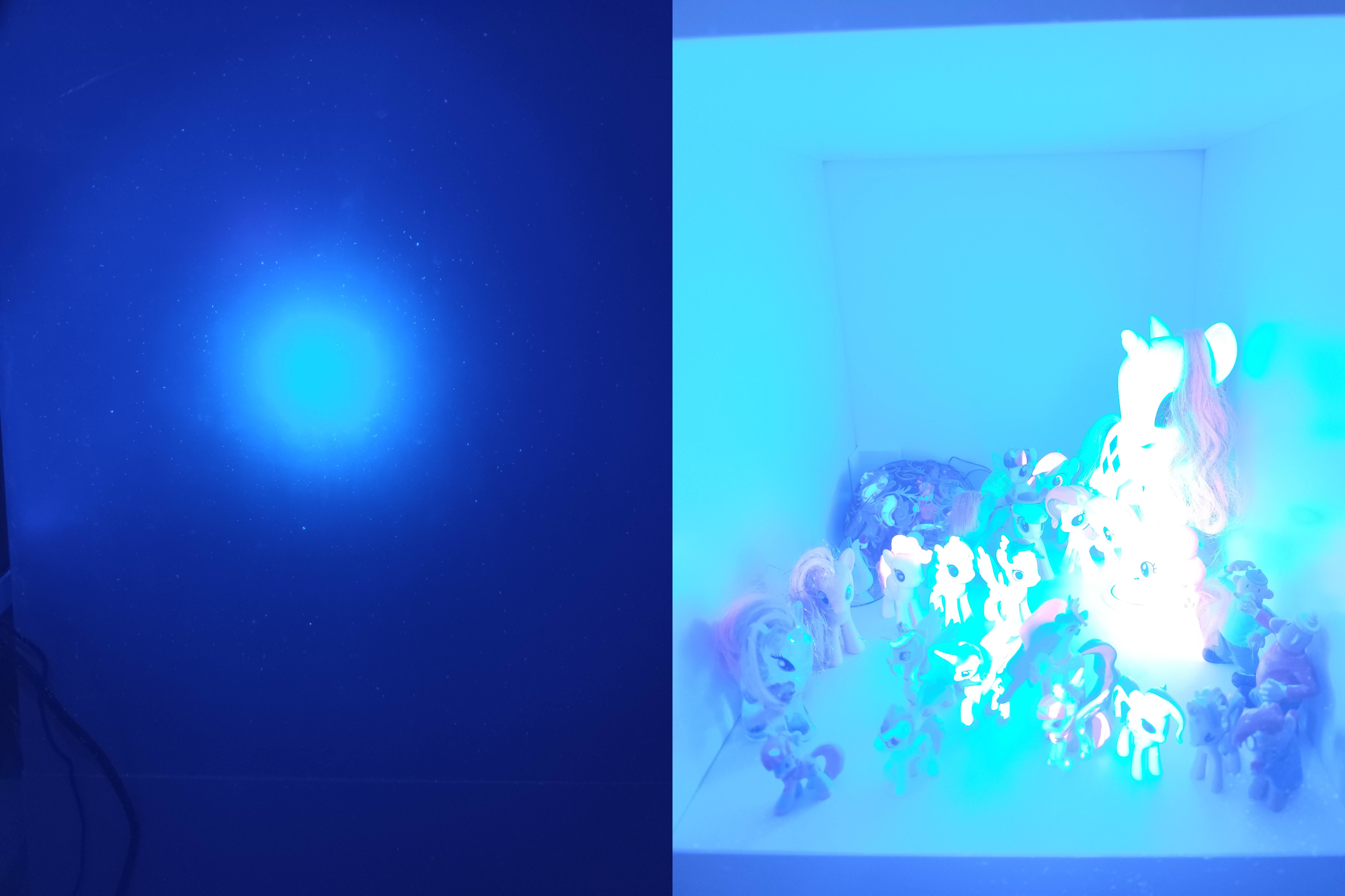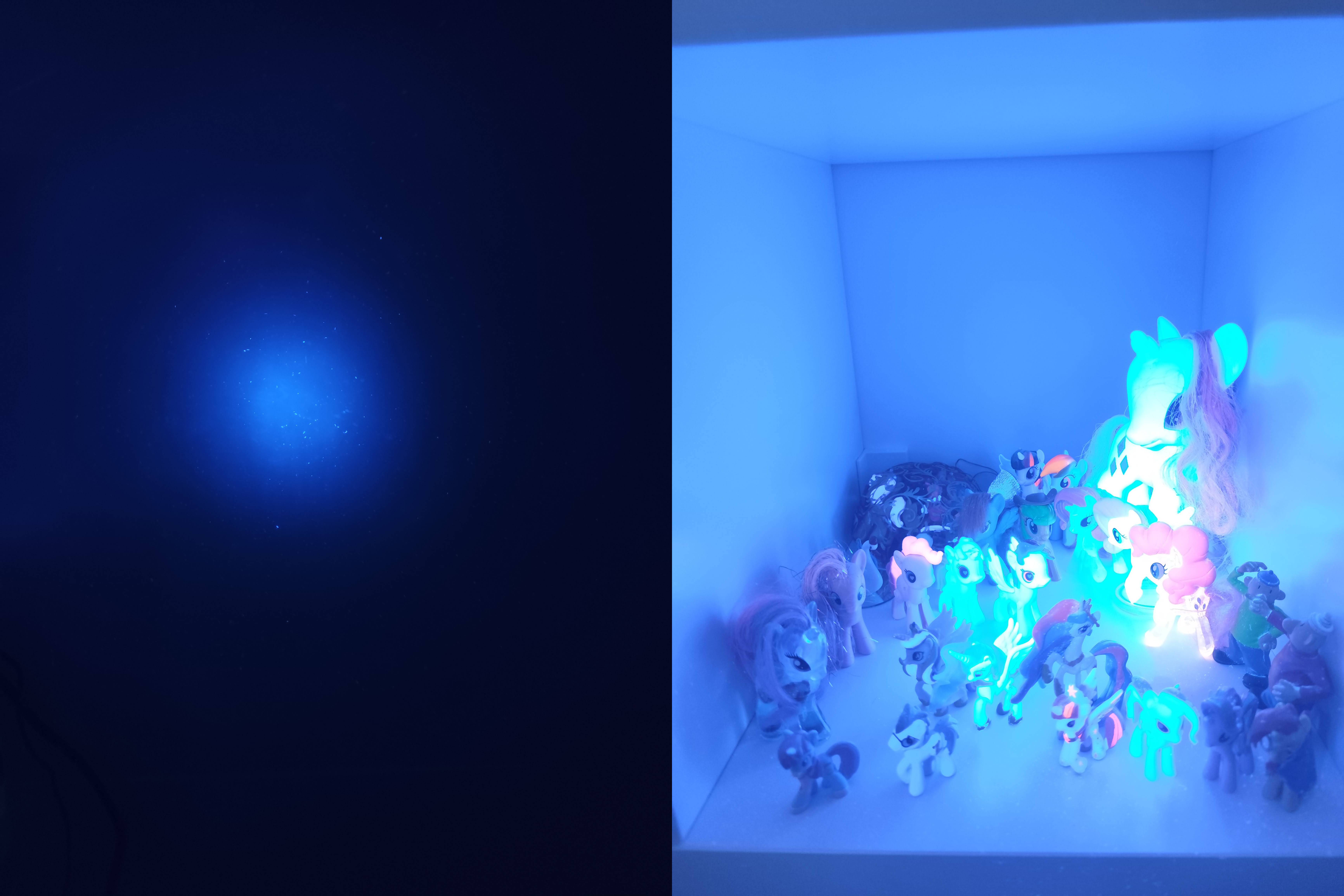 Great UV flashlight! It's amazing to see the world in a completely different spectrum and notice things that are either phosphorescent or fluorescent. The lens provides an excellent visible light cutoff, highlighting only fluorescent materials. The flashlight is definitely worth its price — solid build, well sealed, and perfectly balanced to dissipate heat efficiently. Photos made with the same exposure settings, UV non reactive background and fluorescent colors, using 10%/30%/100% power.