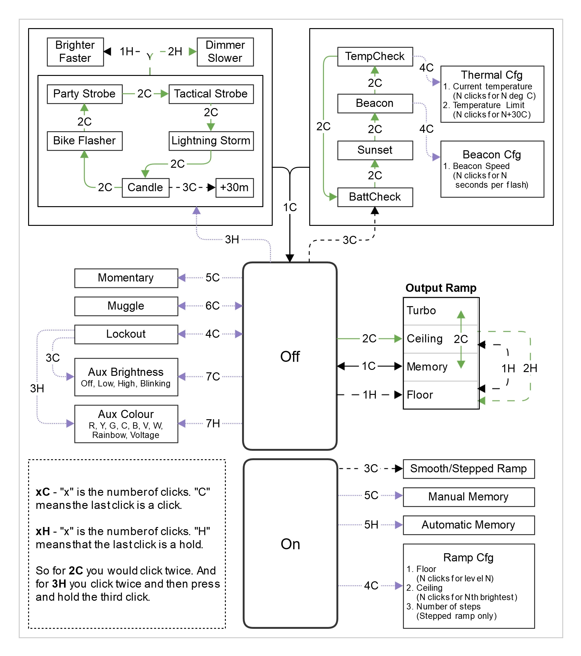 1.click the button ——> flashlight is turned on with last brightness ——> press the button,brightness ramping up ——> release and press the button again,brightness ramping down
