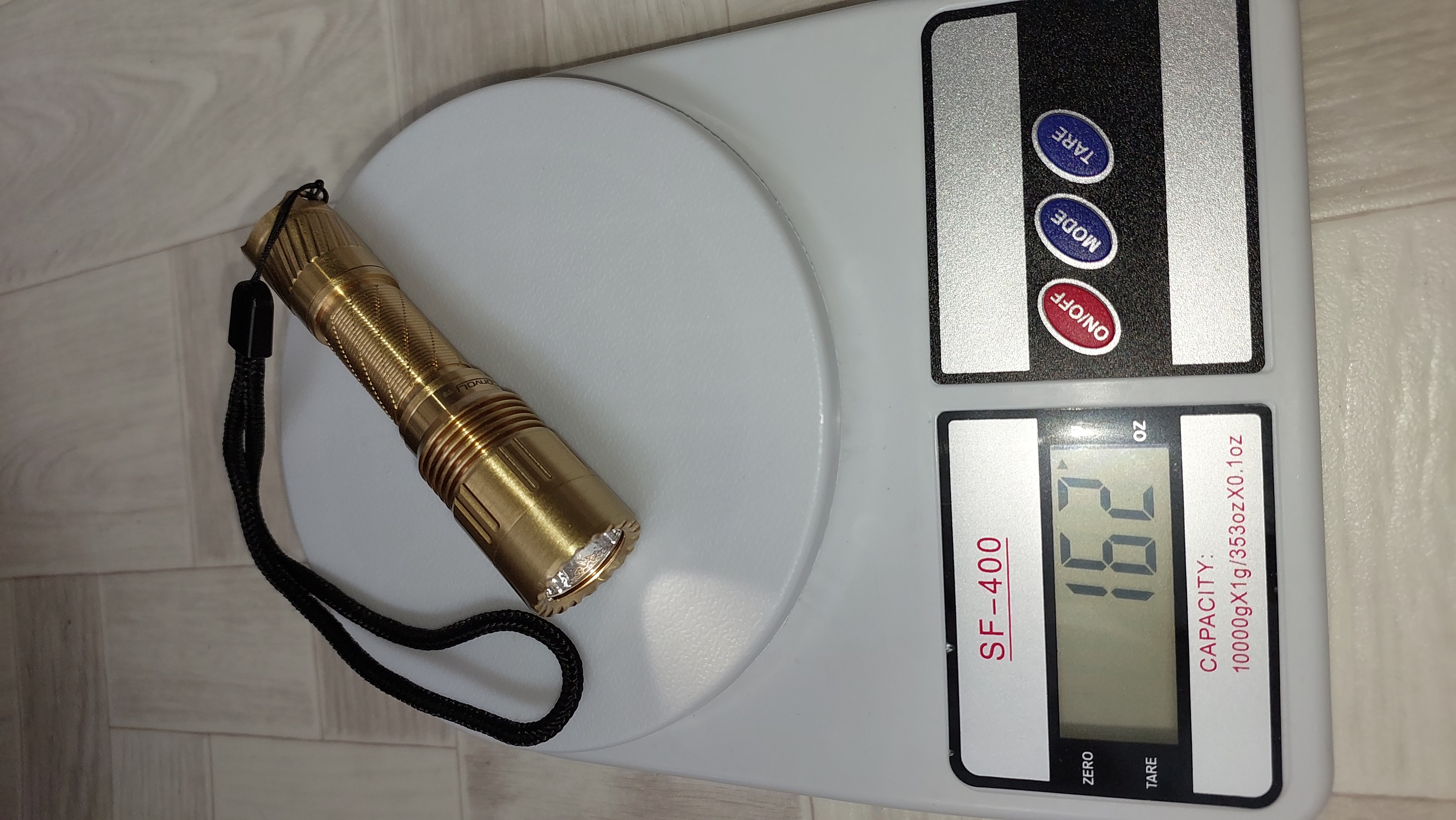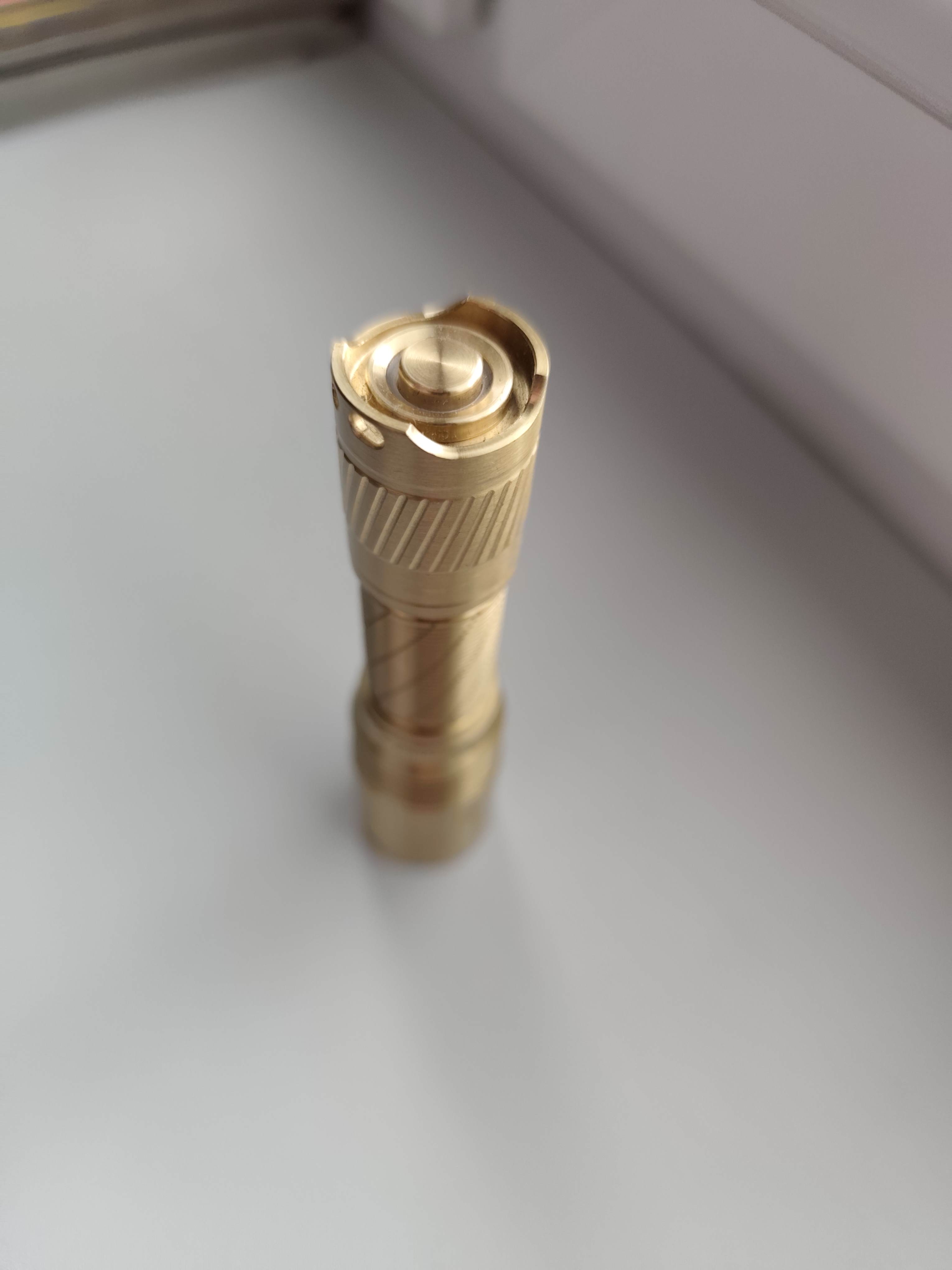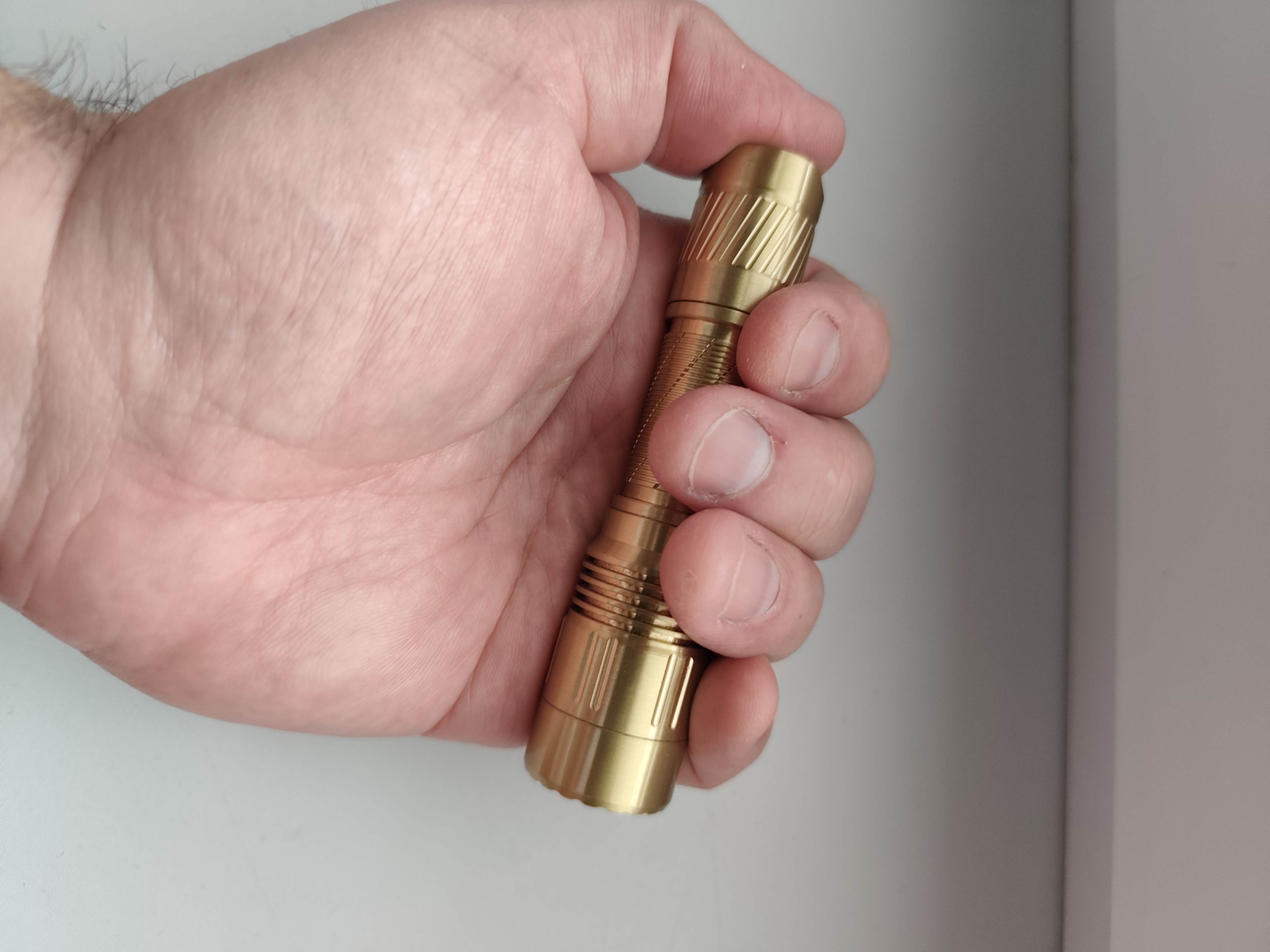 WOW! What a fantastic 14500 cell flashlight. The throw with the SFT25R is amazing for such a small flashlight, I was able to light up a building at 700 feet with ease. The machining is spot on with a perfectly centered emitter. It would be nice if it had a deep carry pocket clip but not a real big deal. It feels very solid and weighs a whopping 164 grams with the 14500 cell, nice! Simon does it again with the brass T6! Thank you!