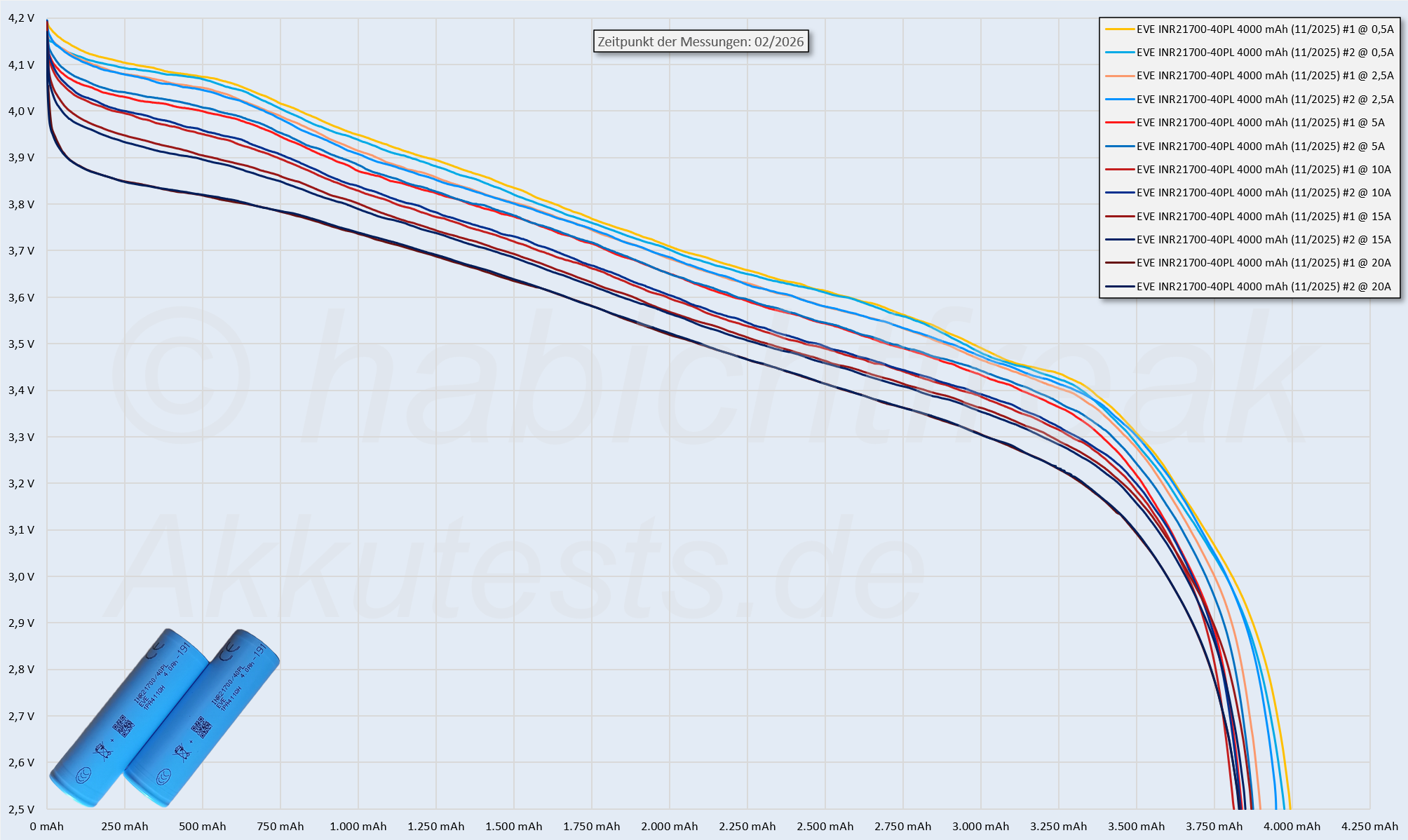 Note: I test batteries in my free time. I analyze discharge curves under different loads, internal resistance, etc. However, I don't conduct long-term tests in the form of cycle tests. My conclusion from the battery test: The comparison between the EVE 40P and 40PL batteries shows what's still possible thanks to the tableless design. The 40P batteries were and are very good. The 40PL batteries deliver slightly more energy at high currents, run cooler, and have an even better voltage stability. This allows for currents that, while likely only relevant in power tools, are generally not practical. If you'd like to read the full test: https://akkutests.de/test-eve-inr21700-40pl.html