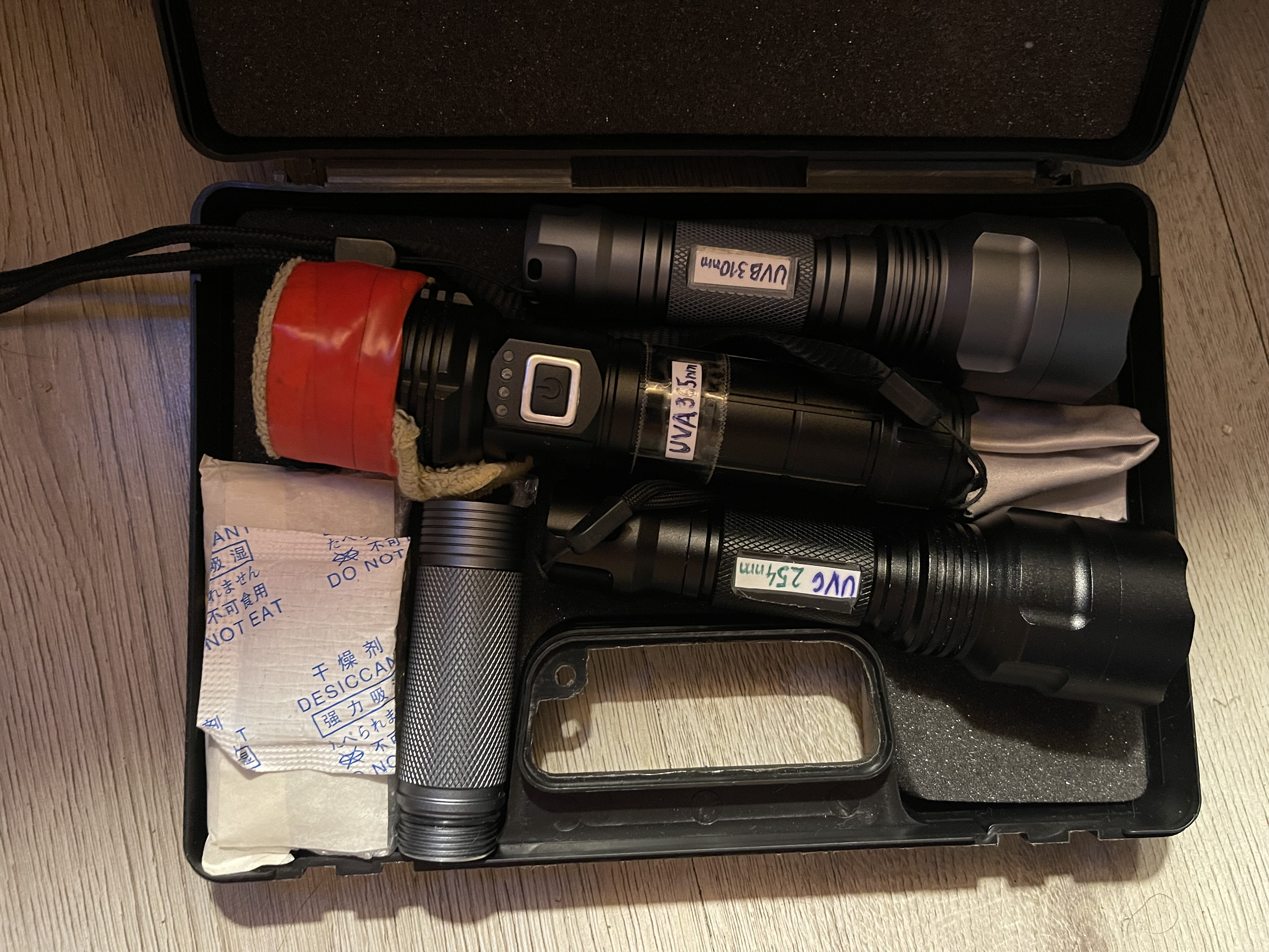 Uvc can cause great harm to human body., please wear anti-ultraviolet clothes and glasses when using this flashlight.